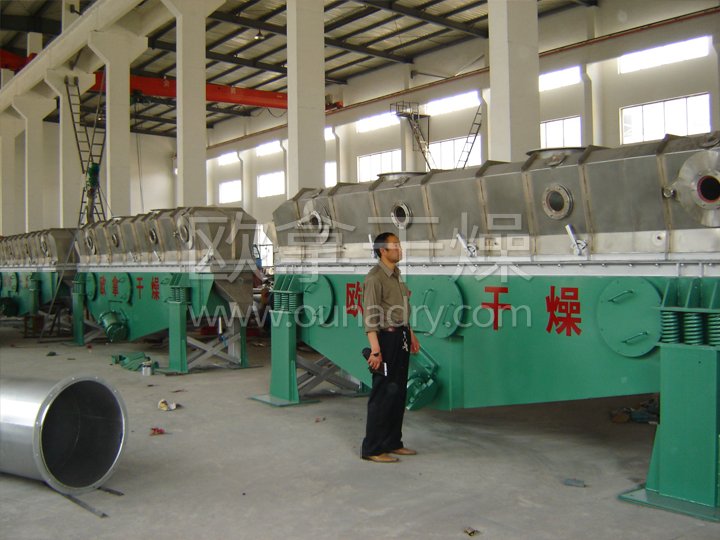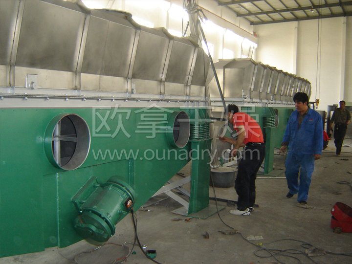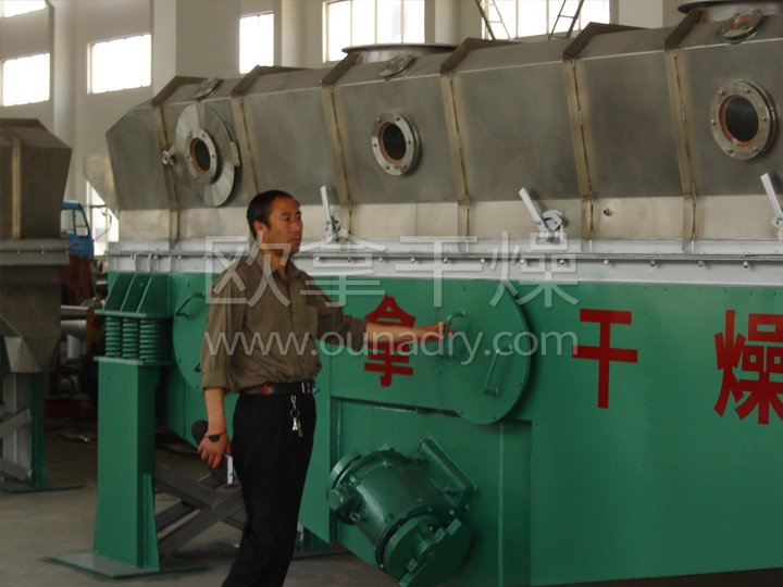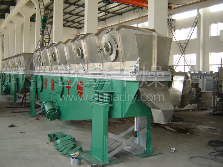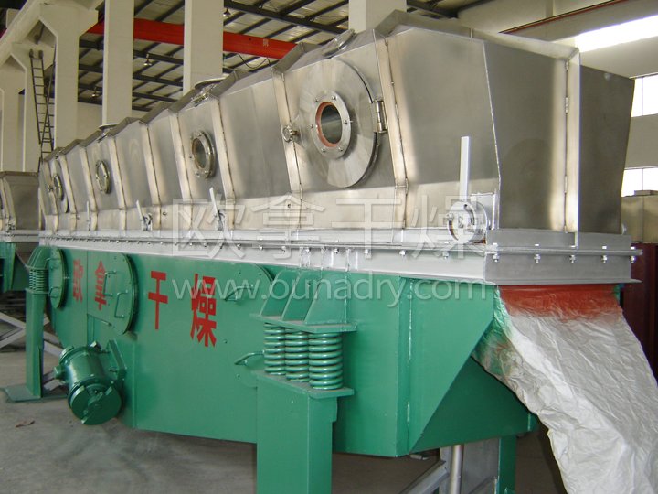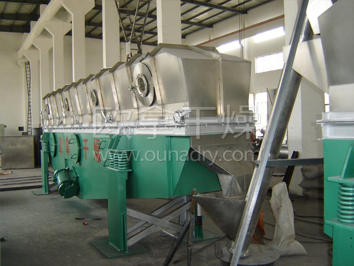物料自進(jìn)料進(jìn)口進(jìn)入機(jī)內(nèi),在振動(dòng)力作用下,物料沿水平面流化床拋擲,向前連續(xù)運(yùn)動(dòng),熱風(fēng)向上穿過流化床同濕物料換熱后,濕空氣經(jīng)旋風(fēng)分離器除塵后由排風(fēng)1:3排出.干燥物料由排料進(jìn)口排出。